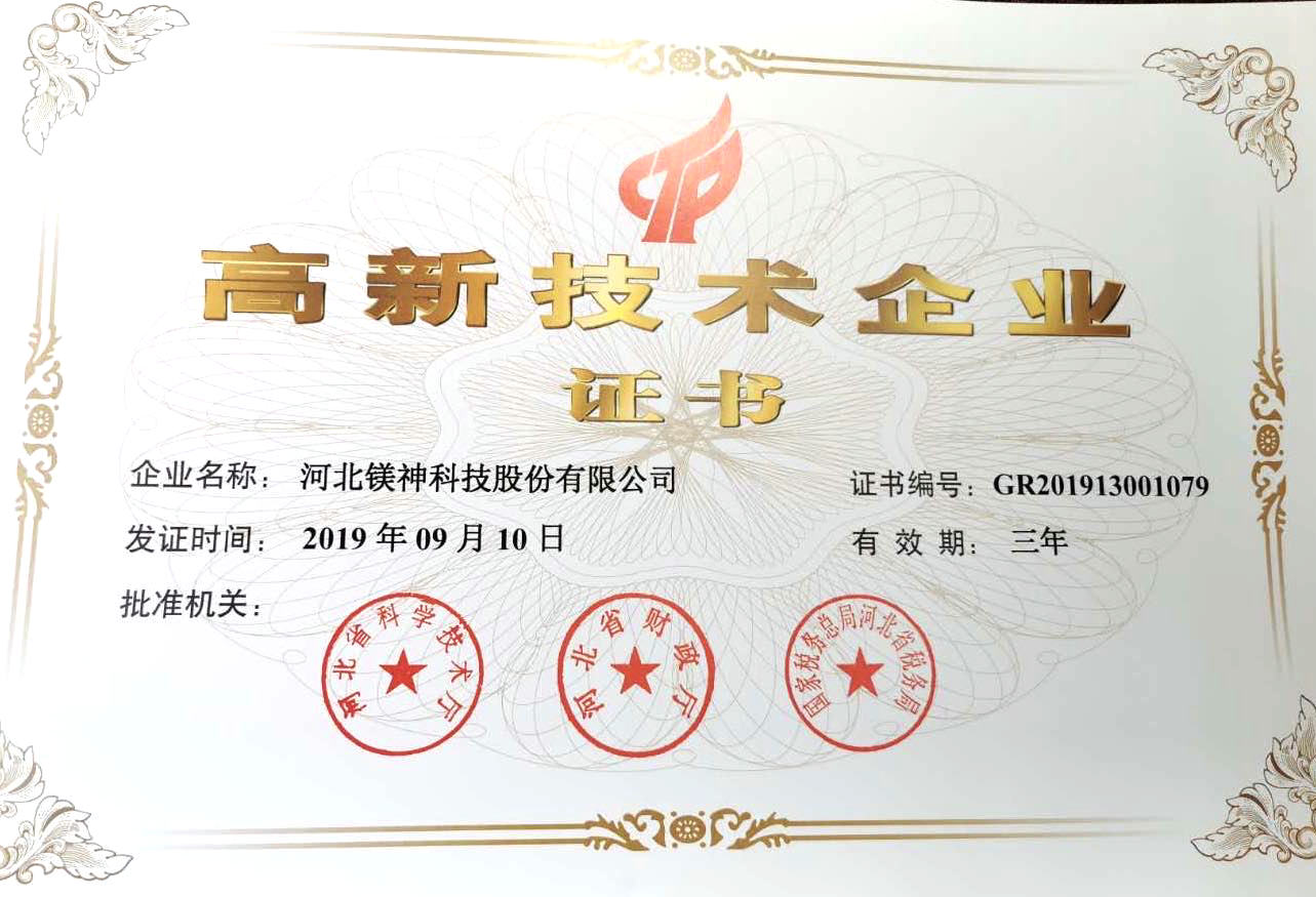 2019年9月10日經(jīng)河北省科學(xué)技術(shù)廳、河北省財(cái)政廳、國(guó)家稅務(wù)總局河北省稅務(wù)局批準(zhǔn),為河北鎂神科技股份有限公司頒發(fā)高新技術(shù)企業(yè)證書(shū),有效期三年。國(guó)家高新技術(shù)企業(yè)門檻較高,認(rèn)定須經(jīng)過(guò)嚴(yán)格的測(cè)評(píng)和審批程序,鎂神科技憑借過(guò)硬的技術(shù)實(shí)力榮獲高新技術(shù)企業(yè),這標(biāo)志著公司在研發(fā)和創(chuàng)新方面得到國(guó)家相關(guān)部門的肯定與認(rèn)可。 因此給了我們公司上下員工很大的鼓舞,這更是對(duì)我們企業(yè)快速發(fā)展、自主研發(fā)的肯定,激勵(lì)了我們企業(yè)技術(shù)研發(fā)的建設(shè),推動(dòng)了企業(yè)經(jīng)營(yíng)的進(jìn)程,我們企業(yè)將繼續(xù)保持產(chǎn)品的高品質(zhì)、高質(zhì)量始終如一。